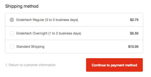 Now let’s test it out! In your demo store that you created the private app, if you don’t already have a product create one, then add it to your cart and initiate a checkout. Enter your shipping information and click “Continue to shipping method”. On the next page the “Shipping method” box will load the rates. At this point is when Shopify contacts your API, and if successful, you should see something like this screenshot (remember the rates will be different depending on the quantity):