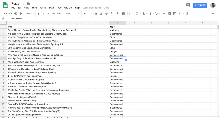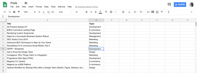 Since we are in the middle of our next content round I decided to take the list of in-progress articles that my fellow coworkers are working on and use it as the test data set. Since we are testing the following data set with our trained model I also had to specify the Topic I felt was most relevant to the blog articles and exported the Google Sheet as a csv.