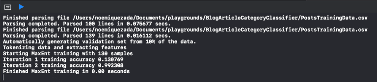 Finally we generate our model, a MLTextClassifier, where the blog article titles are the input data (textColumn) and the topic of the articles are the result (labelColumn). Make sure that the textColumn and labelColumn match the headers in your csv.