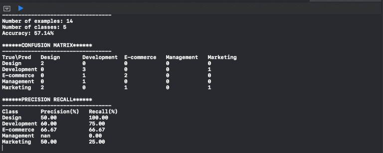To display the results in the debug area I print(result). We get a summary of how the model performed based on the training data set.