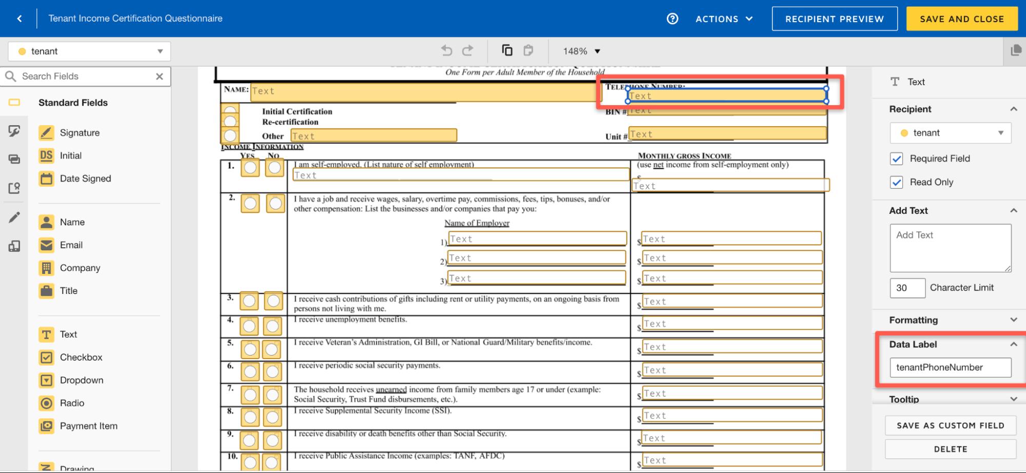 Our client required a custom interface to upload templates and assign field types. DocuSign has an easy to use drag and drop form builder.