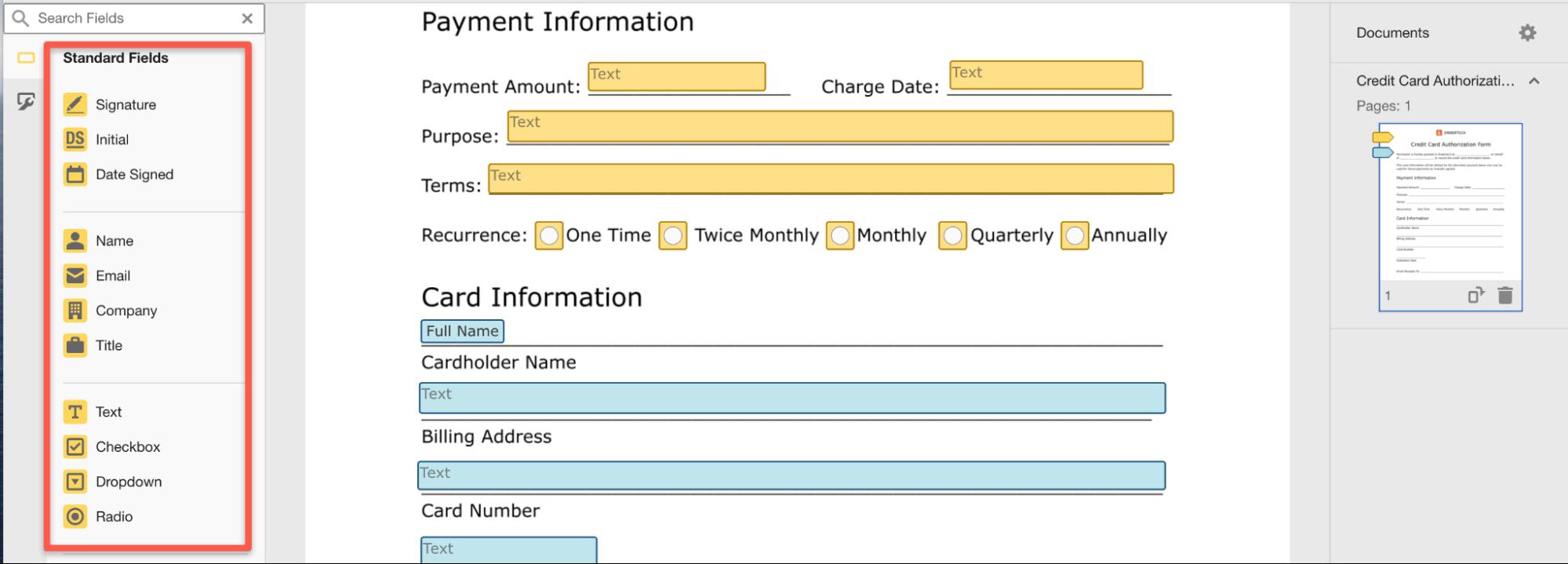 Endertech uses DocuSigns form builder to set up templates with field types.