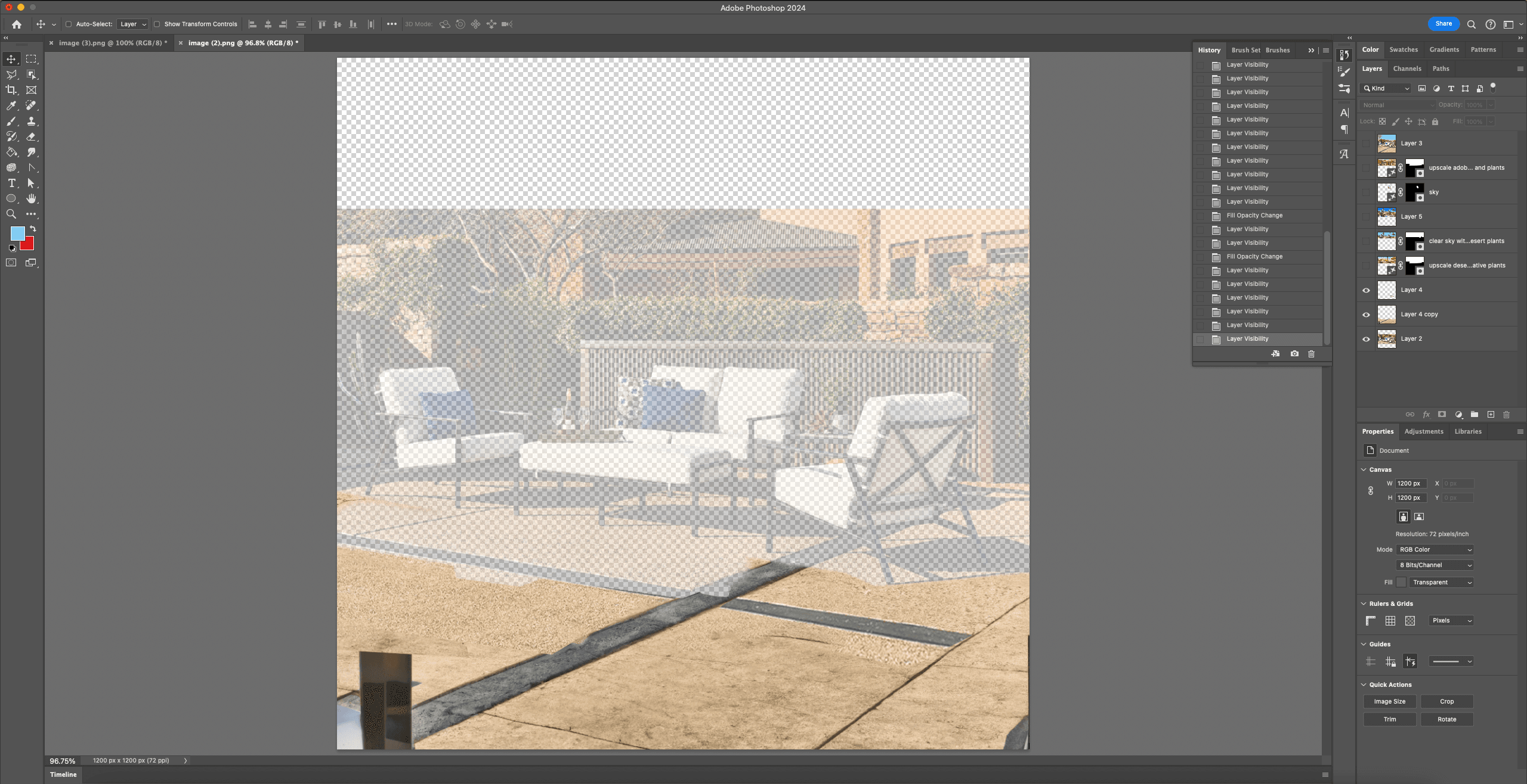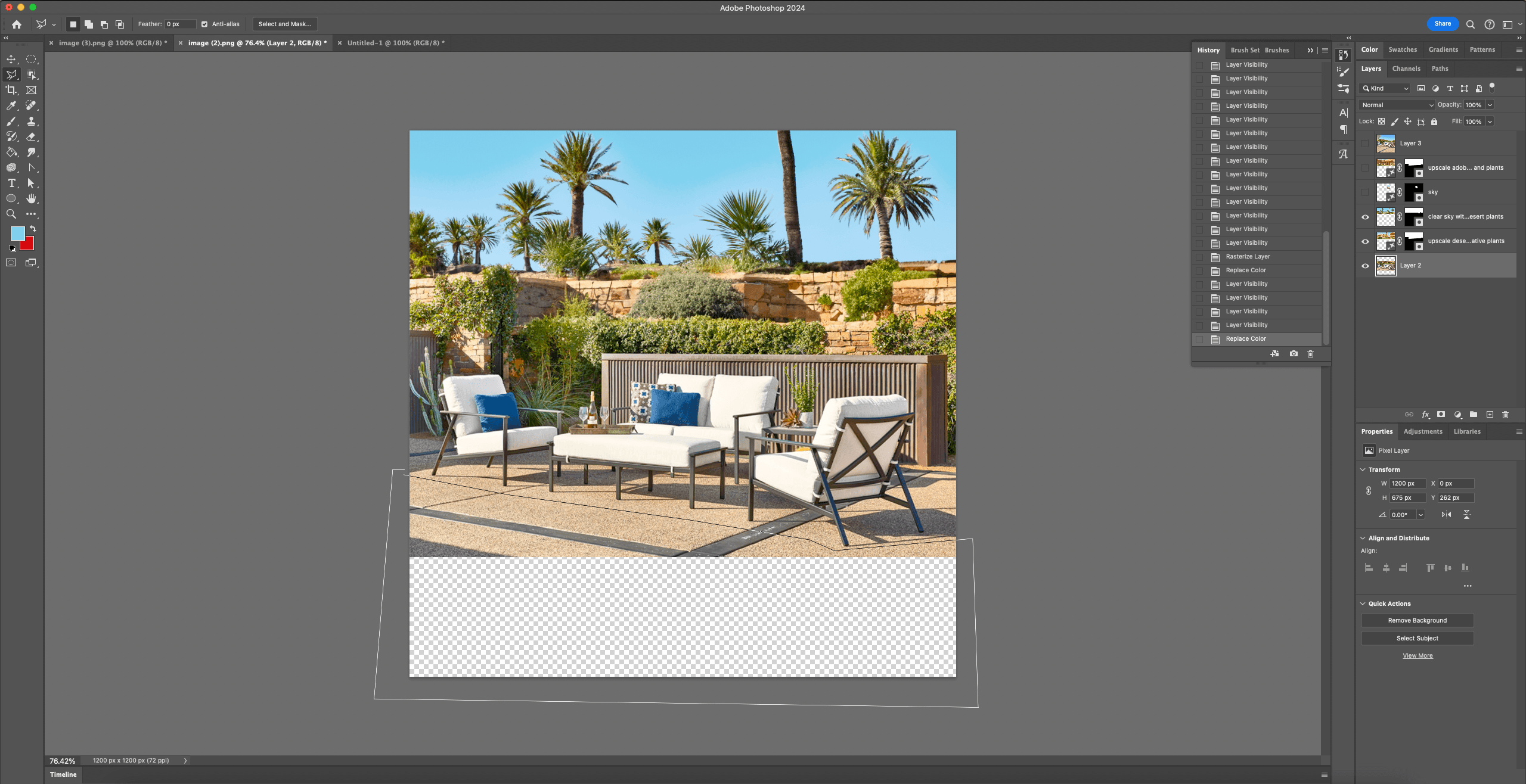 To address these issues, we'll have to go in and manually touch up the new parts of the image, using Generative Fill again to get rid of the random furniture frame, plus some old-fashioned tools like the healing brush to get rid of the artifacts and the clone tool to copy some of the existing patio texture onto the new areas.