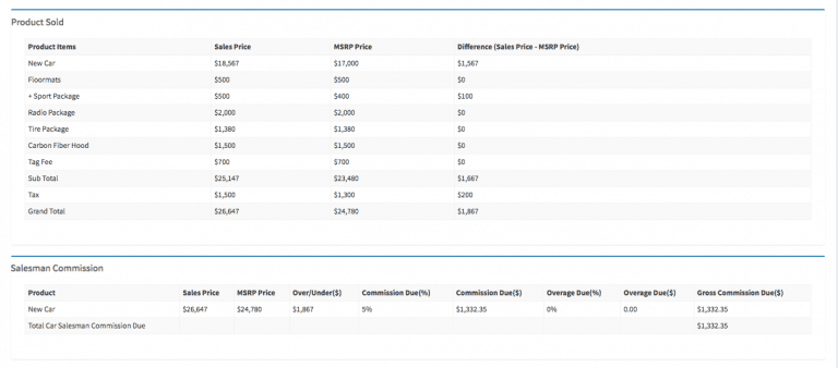 - After the sales contract is signed, a commision calculation page is generated below. This displays in a table of 4 columns. Based upon the over / undervalue of the sales contract, the sales representative is paid a percentage of the total contract.
