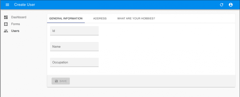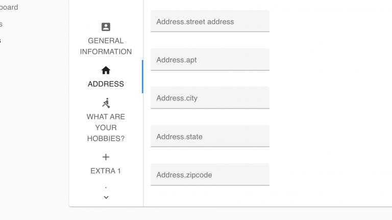 export const UsersCreate = props => ( <Create {...props}> <VerticalTabbedForm> <FormTab label="General Information"> <TextInput source="id"/> <TextInput source="name"/> <TextInput source="occupation"/> </FormTab> <FormTab label="Address"> <TextInput source="address.streetAddress"/> <TextInput source="address.apt"/> <TextInput source="address.city"/> <TextInput source="address.state"/> <TextInput source="address.zipcode"/> </FormTab> <FormTab label="What Are Your Hobbies?"> <ArrayInput source="hobbies"> <HobbiesCustomIterator/> </ArrayInput> </FormTab> </VerticalTabbedForm> </Create> );
