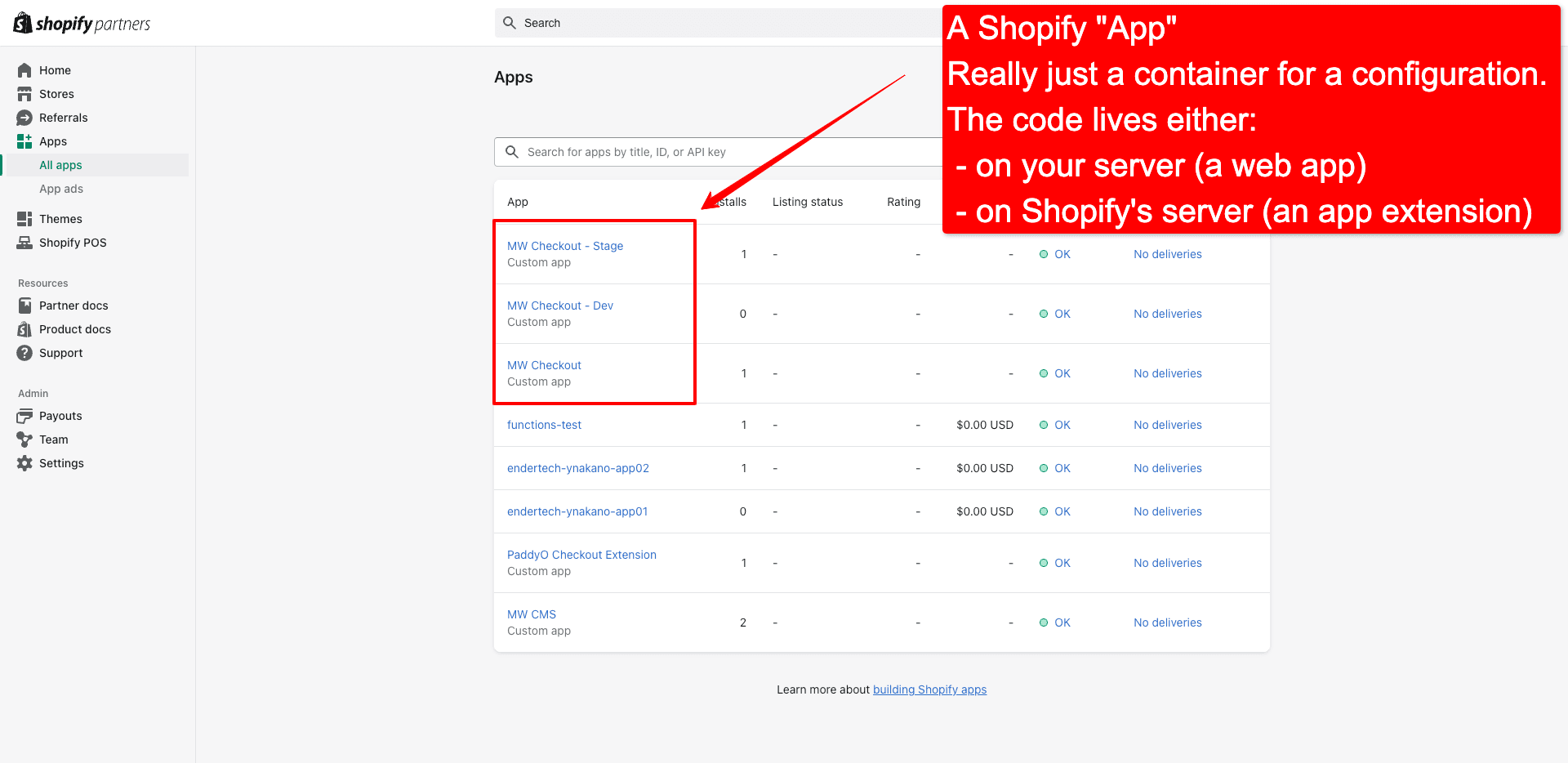 And before we transition to discussion about deployment, let's address the concept of a "Shopify App" from the Partner Dashboard perspective. There, you see a list of things called "Apps", but really they are just containers for your "App Configurations". The source code itself lives either on your own servers, in the case of your Web Apps, or elsewhere on Shopify in the case of your App Extensions.