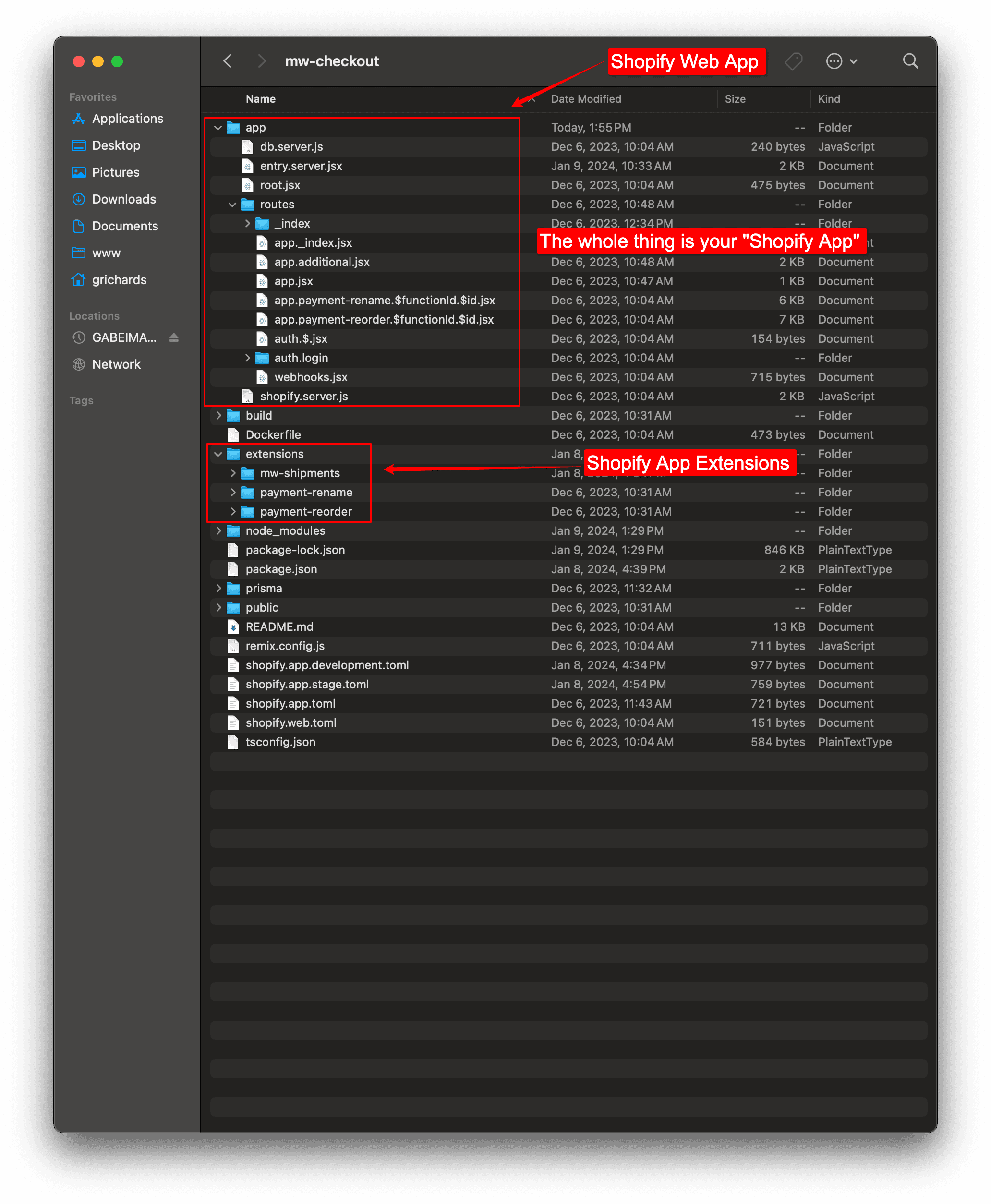 So, if the whole thing is your "Shopify App", then the code in the "app" directory is your "Web App", and the code in the "extension" directory is your "App Extension". See this illustration for more clarity: