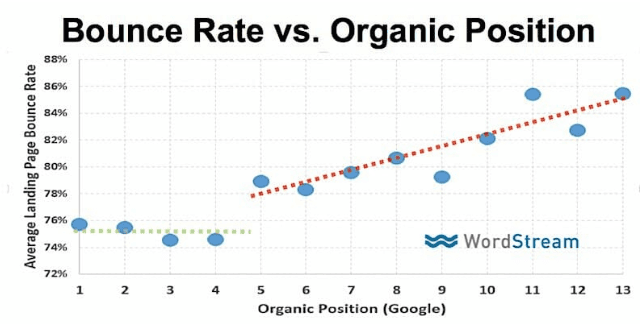 Engagement as evidenced by Bounce rate (visits of a single page view) is especially noteworthy, as according to research done by WordStream, there’s a correlation between bounce rate and a page’s organic position. As bounce rates rise, the lower (worse) a site generally becomes ranked in search.