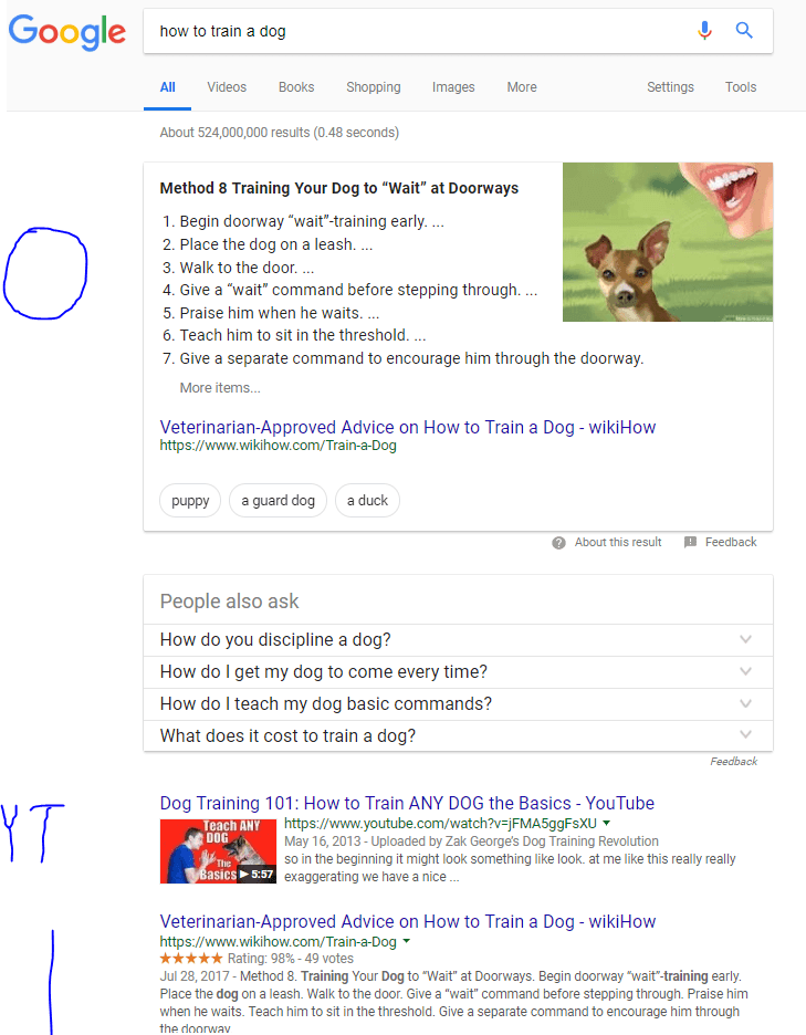 The Google algorithm has evolved toward understanding user intention, beyond the user’s typed in keywords: What do they expect, what are they actually looking for, and what search results would truly best help answer their query. For a large number of queries there is now a search result #0 – the block of informative content above the search text listings showing the best answer. The percentage of queries that had a rich result listing 0 in recent years:22.6% in 2014 31.2% in 2015 40.0% in 2016 Notice in this example how rich result listing 0 appears at the top, followed by a YouTube (YT) link, and only then the first organic text link on the page. Sometimes PPC ads will also appear above result 0: