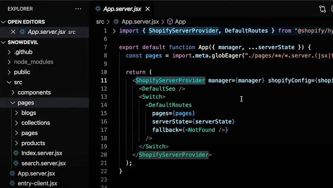 If you’ve used React in the past, you’ll feel right at home with Hydrogen. It retains most of the default React folder structure with a public directory for static assets and src (source) directory for the application code. In addition, it incorporates Shopify liquid templates for pages, blogs, collections, and products inside the source directory.