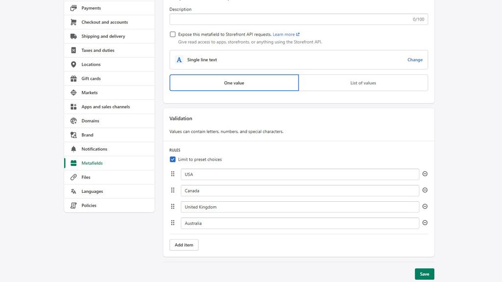 Click Add item to add more items, reorganize them using the six dot icon, and click Save when you’re done to finish creating the metafield definition.