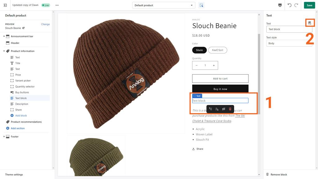 After you’ve configured the metafield on the backend, it’s time to connect it with your Online Store 2.0-based theme so it displays on the frontend. Follow these steps to connect a metafield to your theme.