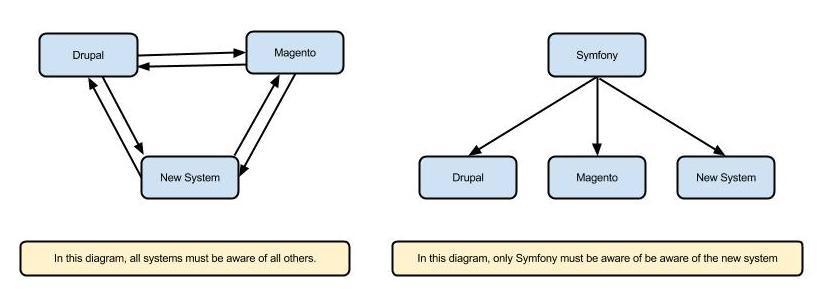 Wrapping the other systems in a PHP framework to handle authentication for multiple sites became the obvious choice. We employed Symfony but others such as Yii would have also worked. At a basic conceptual level, using Symfony obviated necessity of having the Drupal and Magento sites interact (as well as allowing for a simple “plug in” of a different CMS site in the future).