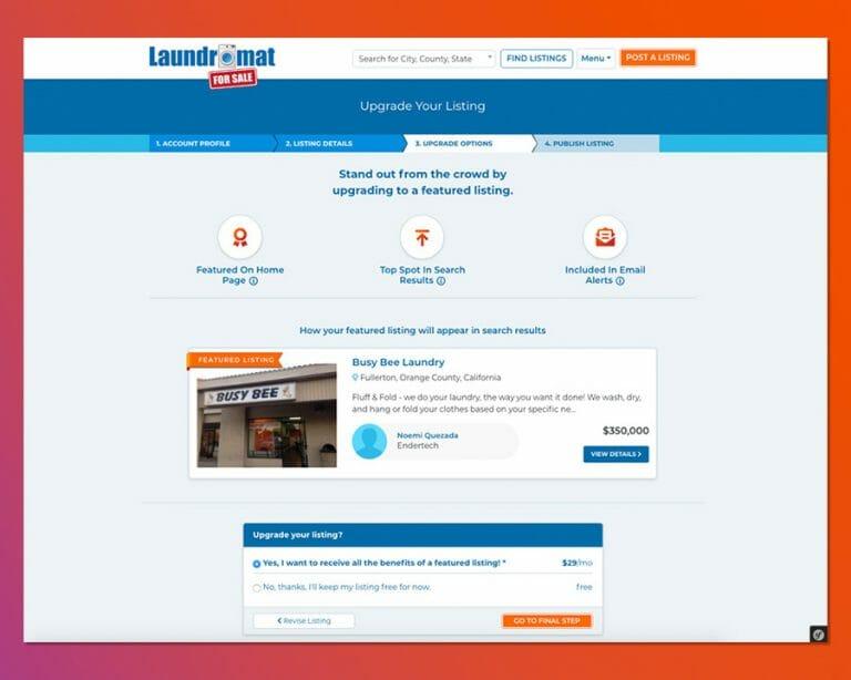On the site, a seller can list a laundromat and pay a flat $29/month, with the ability to add more than one laundromat under the same account. However, unlike in our first example, the client wanted upgrades (the addition of a more laundromats) to be collected immediately instead of the next bill cycle, which required custom Stripe developer programming. While Stripe would set the billing for the next period at the normal rate, if listings were added before a new billing period began, it needed to prorate the cost per month.