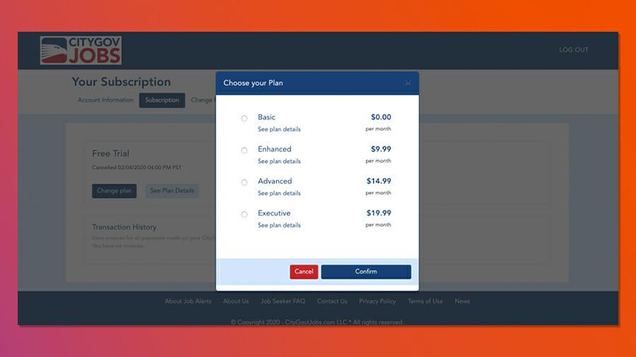 The third example, citygovjobs.com, required a much more complicated method of Stripe payment billing. This site includes job listings for various positions in public municipalities. On this application, there are two types of users who pay for access for different reasons. The first group are job seekers, and the second group represents human resource departments of city employers.