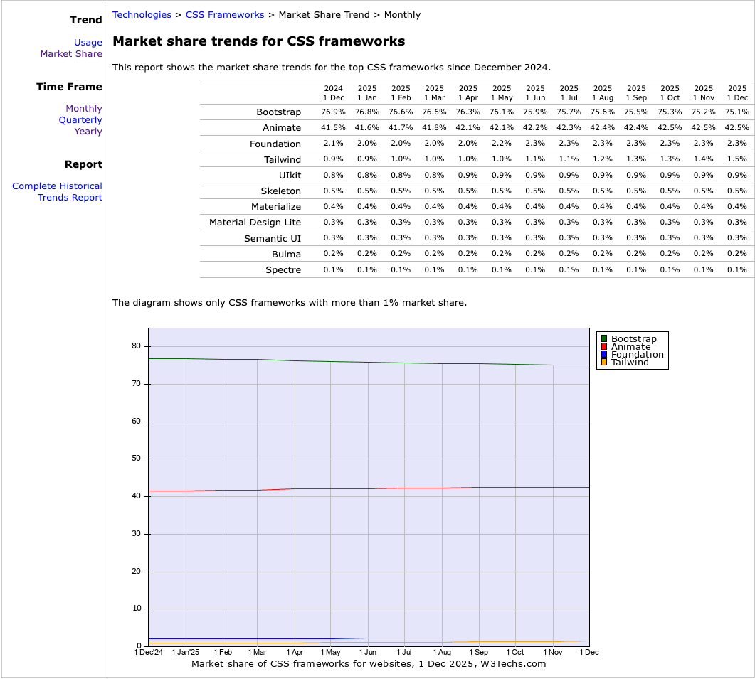 Let me start with the data. According to W3Techs, Bootstrap still commands 75.4% market share as of September 2025, down slightly from 77.1% in September 2024. That is not a framework in decline. That is remarkable stability.